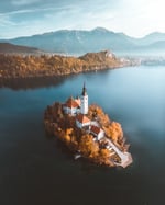 Lake Bled from above, Slovenia, october 2021. This church was built at the end of the 17th century. The traditionnal transportation to the island is a wooden boat known as a pletna.