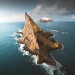 Tindhólmur is a little island rising from the sea. It almost looks like there’s a huge shark underwater rising its fin through the water surface. Faroe islands, february 2023.
